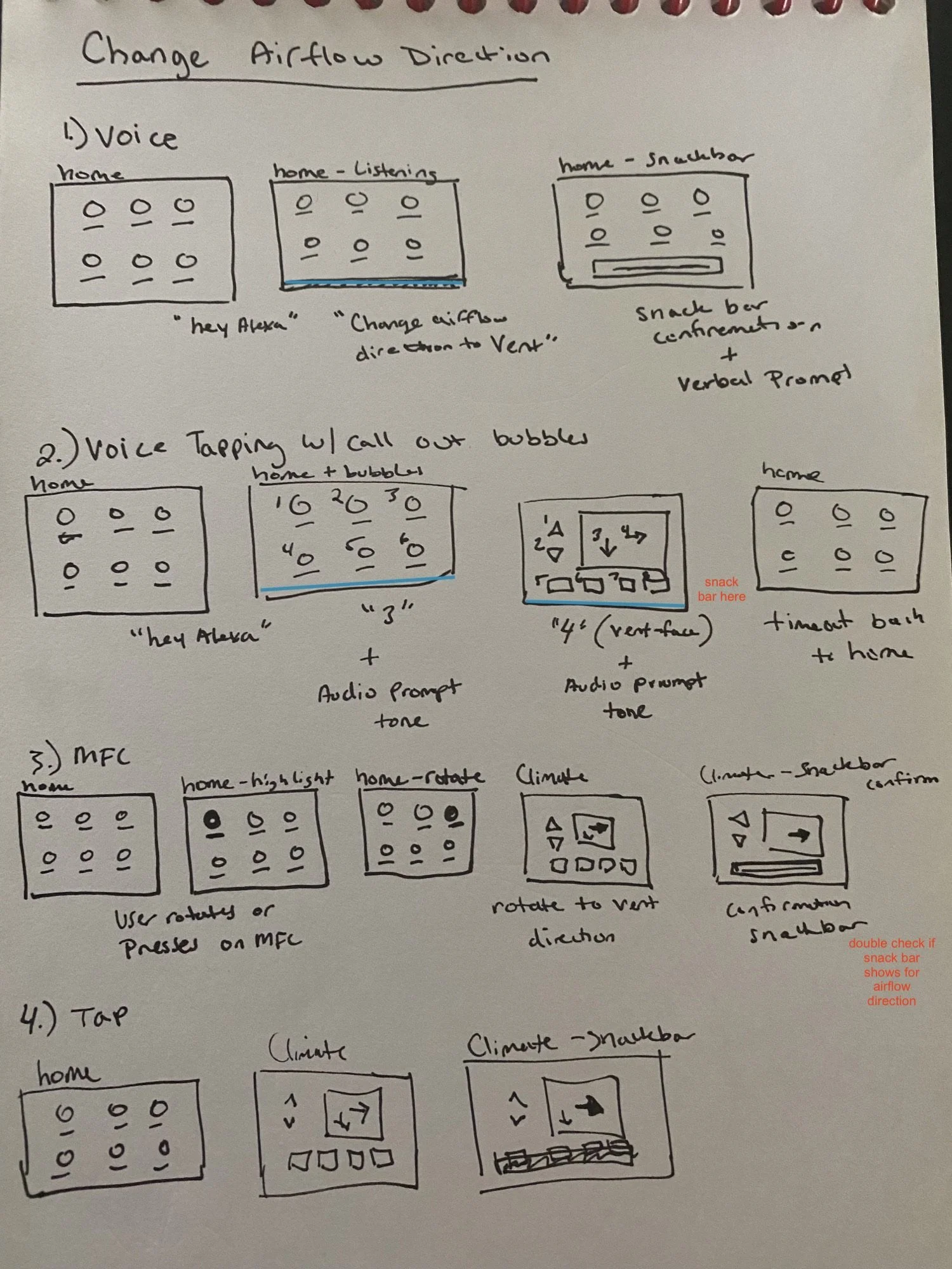 I began by sketching the conversation flows, which were then prototyped in Axure. Participants interacted with the prototype in a mock-vehicle, where it was loaded onto the infotainment display. They were tasked with completing four tasks using their preferred method (voice, touch, or MFC). Afterward, they repeated the same tasks using specific inputs (touch, MFC, natural language voice commands, and Voice Tapping). Following each task, participants compared the ease of using Voice Tapping to the other input methods. Additionally, they evaluated different audio feedback options to confirm the voice assistant understood their selections during Voice Tapping. Lastly, participants provided follow-up feedback on their experience using the feature.